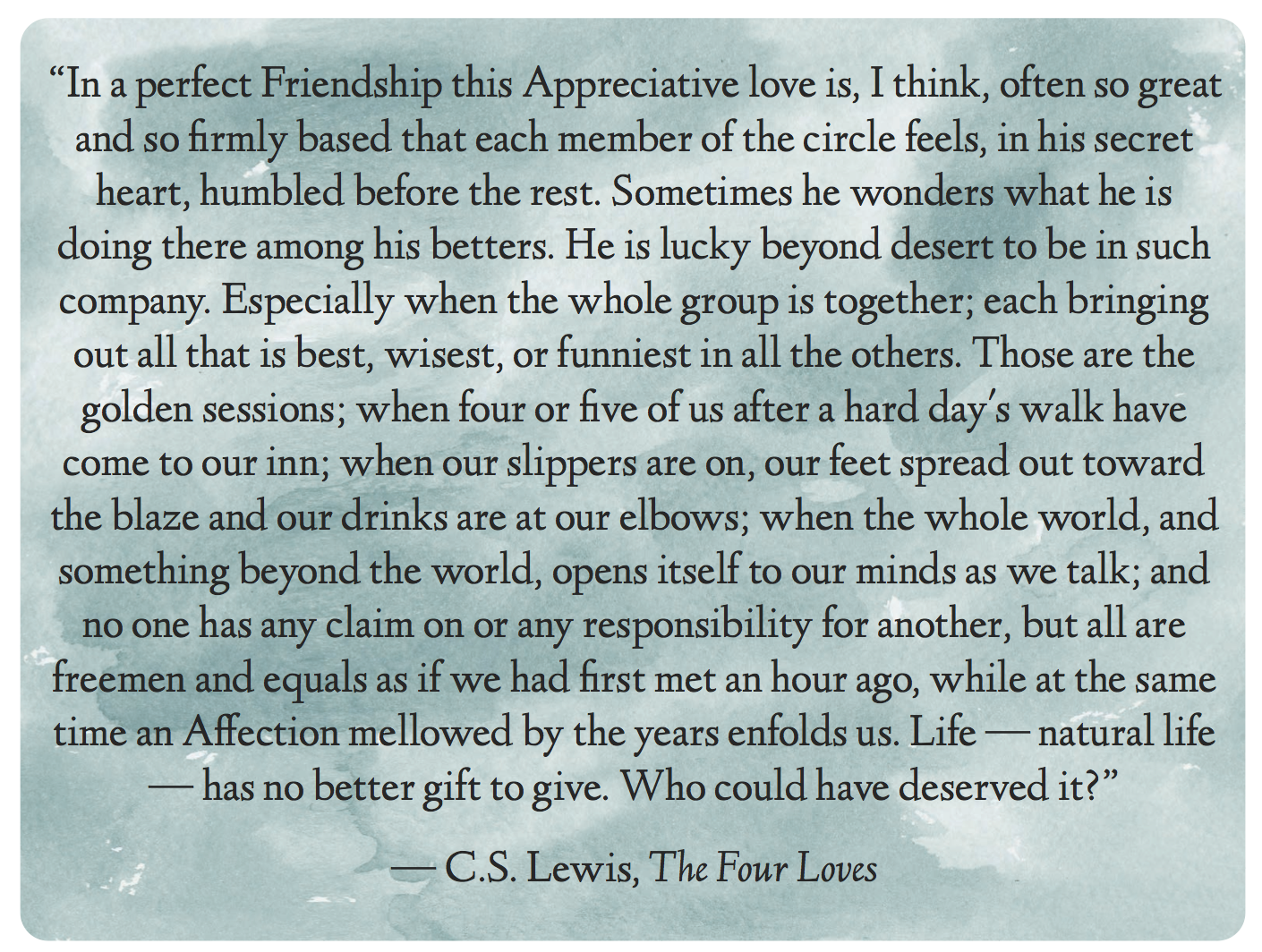 And I can’t help every year but to recall one of my favorite lines from C.S. Lewis about friendship. He sums it up far better than I ever could… and I pray you have a friendship or two like this….that you ask the hard questions and go to the dark places and wait deep into the silence after someone has seemingly finished answering, because there is more to say. And I pray that you could call out in one another the truths of who you are and how you are loved and that we are in this together. This is the fullness of life. The heights and the depths experienced in the sweetest and most honest friendships. Cheers.